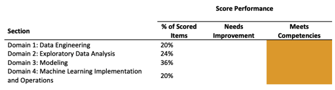 Performance per section for the AWS Certified Machine Learning exam, provided by AWS: